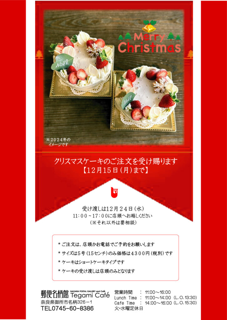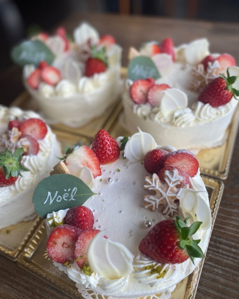 『ふぁーむ・いわい』さんの古都華いちご、クリスマスクッキー、純生クリーム、国産小麦粉、西川養鶏場さんの卵を使った手作りのケーキです。(写真は昨年のもの)